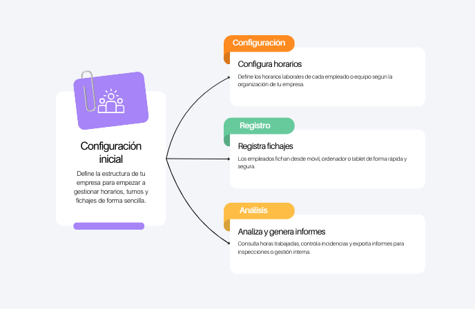 Los trabajadores registran su entrada y salida desde móvil, ordenador o terminal de fichaje con un sistema rápido y seguro.
